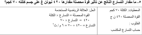 ما مقدار التسارع الناتج عن تأثير قوة محصلة مقدارها ٤۲۰ نيوتن غ على جسم كتلته ۷۰ كجم؟